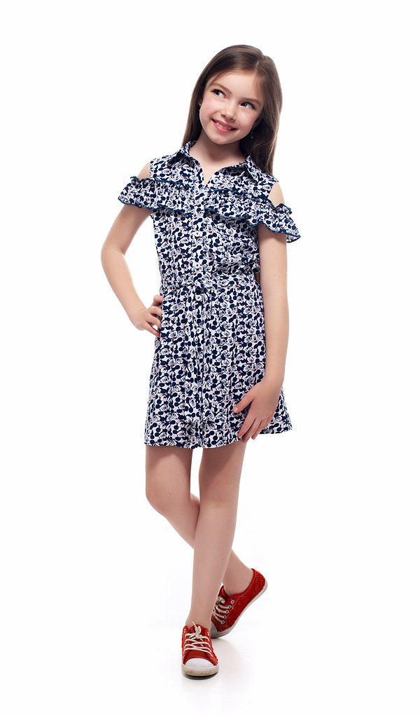 Платье из лёгкой хлопчатобумажной ткани, штапеля. Застёжка-пуговицы, поясок. Отделка рюша на нежной зборке.