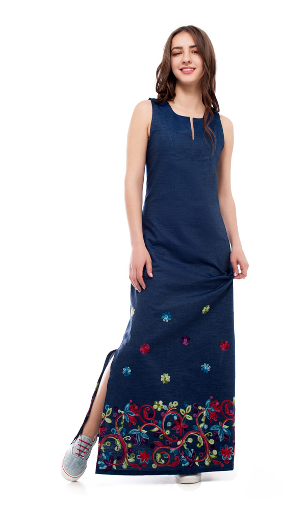 Платье из летнего денима с вышивкой. Молния на спинке, разрезы сбоку.