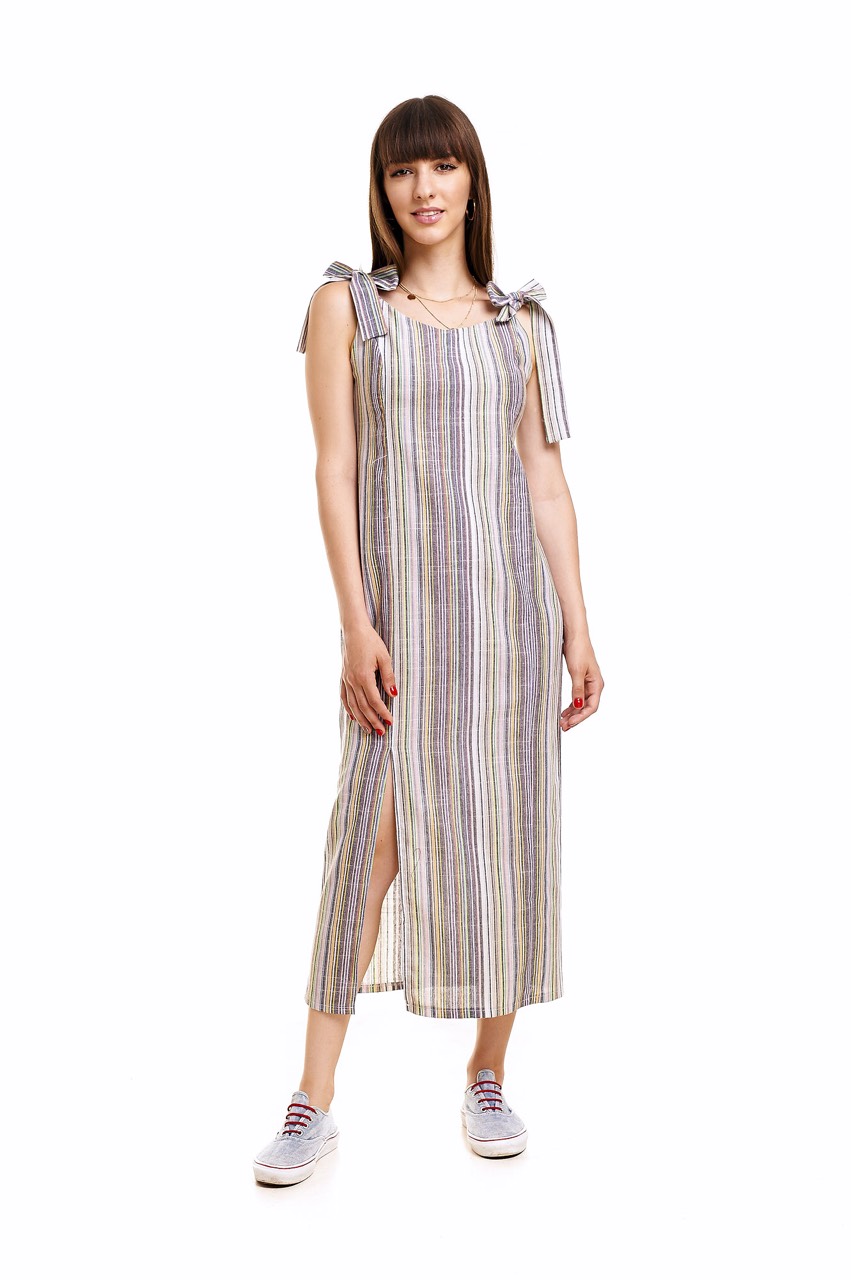Сарафан из льна женский . Модный полосатый принт. Разрез на ножке. Спинка и бретели на завязках